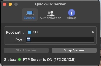 サーバ環境を構築できれば何でもいいですが、近ごろのMacOSはFTPサーバ機能を排除されてしまったので、サードパーティーのFTPサーバアプリ「QuickFTP Server」を使いました。