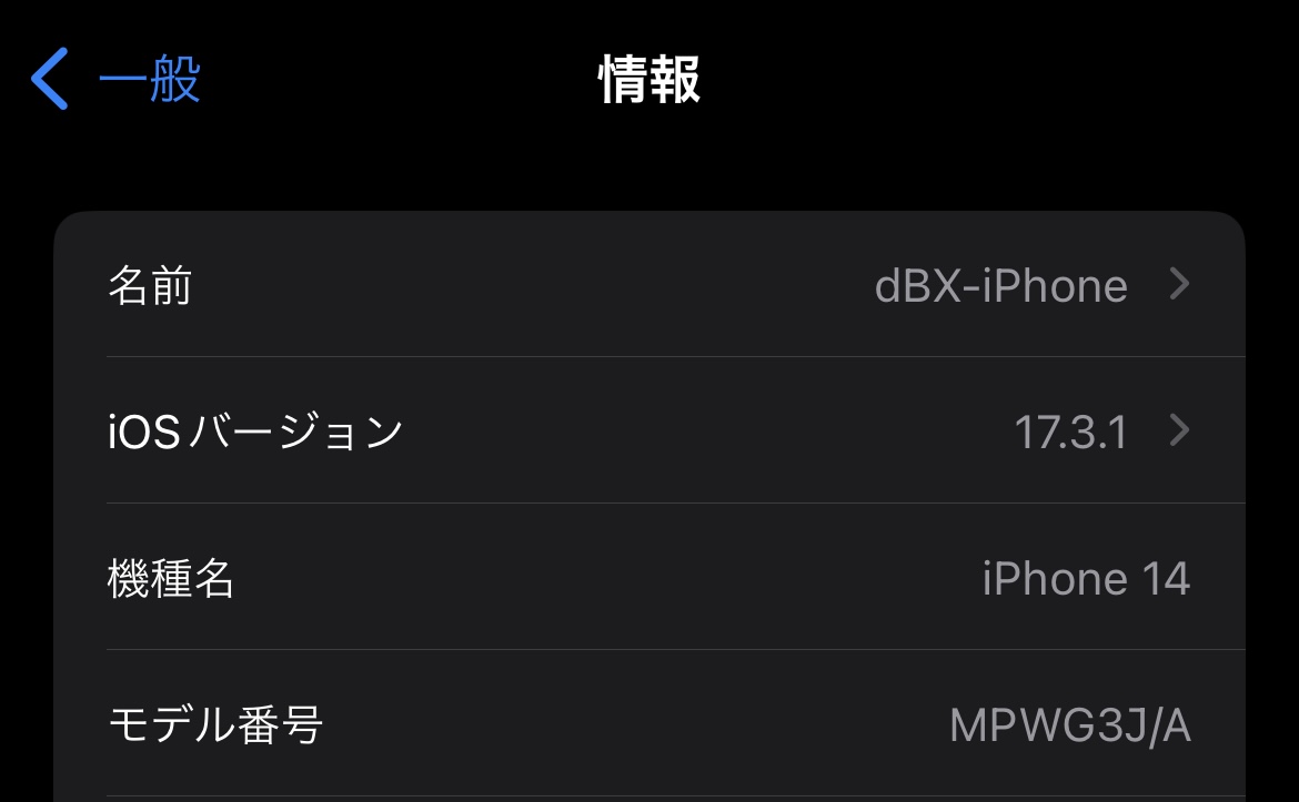 よって、あらかじめ設定→一般→情報→名前から半角英数記号の文字列に変えておきます。