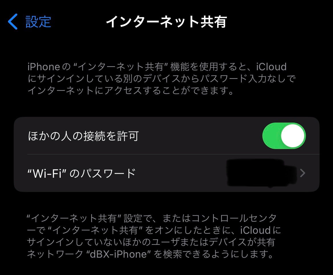 パスワードは設定→インターネット共有で設定しているパスワードです。